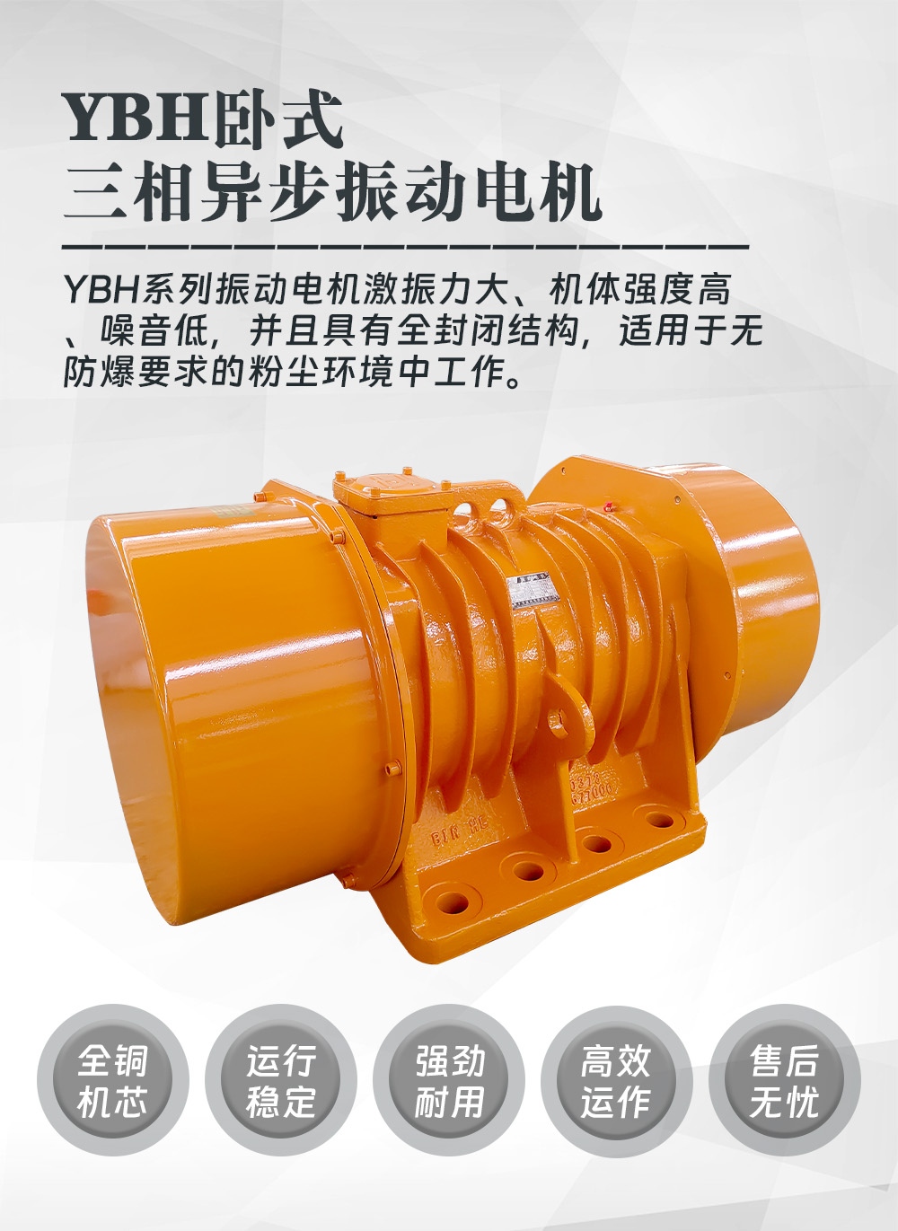 此外,YBH振動電機的全銅結構保證了電機的運行和降低了磨損,其激振力的可調節性使其能夠滿足不同工況的需求,廣泛應用于礦山、建材、化工等領域。