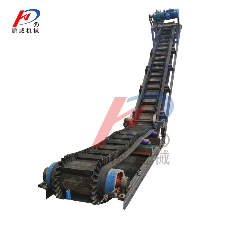 大傾角皮帶機 (擋邊帶式輸送機) 其結構是在平形橡膠運輸帶兩側粘上可自由伸縮的橡膠波形立式“裙邊”在裙邊之間又粘有一定強度和彈性的橫隔板組成匣形斗使物料在斗中進行連續輸送。大傾角皮帶輸送機 (擋邊帶式輸送機)可廣泛用于煤炭、糧食、建材、化工、水電和治金等部門,在環境溫度為-19°C~+40C范圍內,輸送堆積比重為0.5-2.5t/m3的各種散狀物料。對于輸送有特殊要求的物料,如高溫、具有酸、堿性、油類物質或有機溶劑等成分的物料,需采用特殊的擋邊輸送帶。