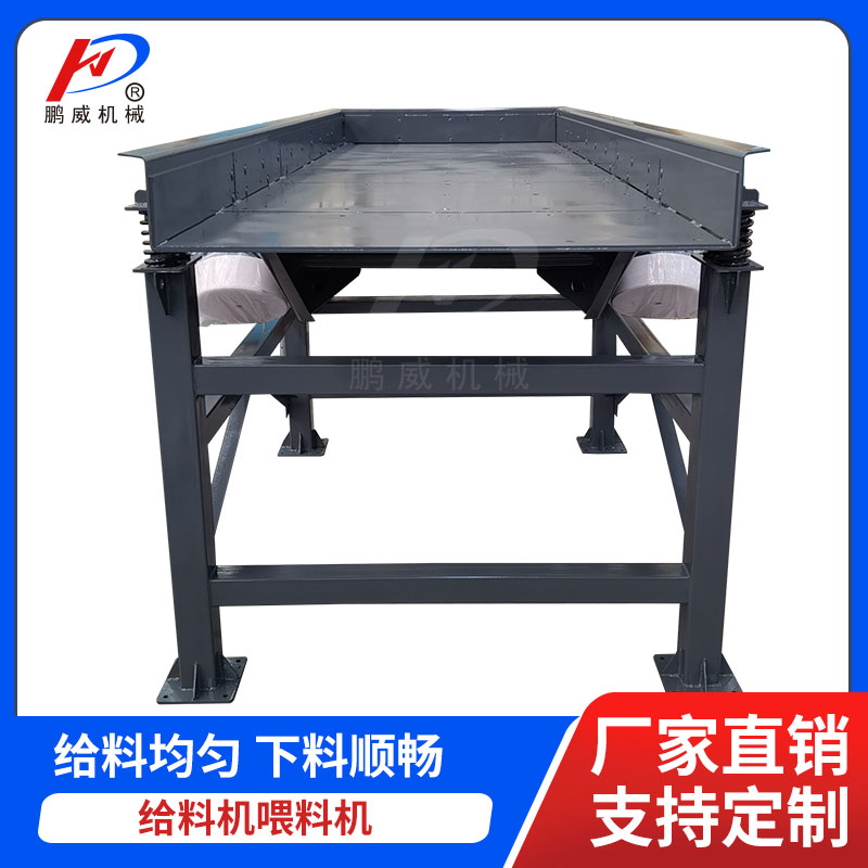 振動給料機主要由振動機架、振動電動機、彈簧、支承座及耐磨襯板等組成。由于振動電動機的啟動,使機架在支承彈簧上作強制振動,物料則以此振動為動力,在料槽上作滑動及拋擲運動,從而使物料前移而達到給料目的。
