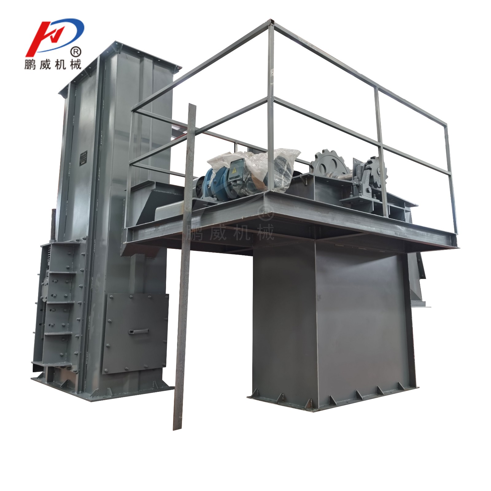 1、上部裝置:安裝有軌道(雙排道),防止鏈條擺動,逆止器,防止料斗回轉,物料阻滿下部機殼,卸料口裝有橡膠板防止回料。
