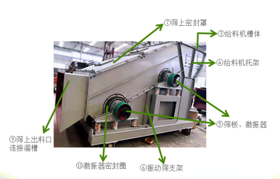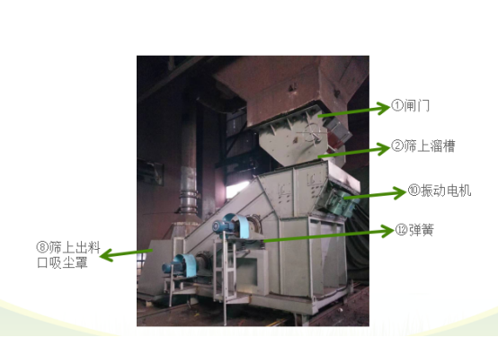 2、振動(dòng)給料機(jī)放置于振動(dòng)篩內(nèi)部,減少了灰塵外溢的開(kāi)放點(diǎn),將閘門(mén)溜槽直接插進(jìn)振動(dòng)篩入料口的給料部分,提高了環(huán)保效果。