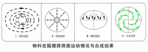 搖擺篩的篩和簸兩種運動使物料在篩網上面進行螺旋漸開線的運動,這種運動軌跡使物料能在有效的篩分面積上,走相對長的路,以提高篩分精度,獨特的設計使物料在網上運動的時間要比其他篩機長,所以篩分產量也相對較高。