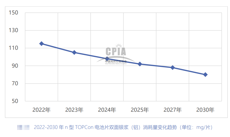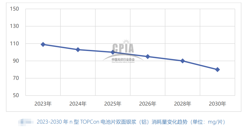 然后,我們回顧2022~2023版的中國光伏產業發展路線圖時看到,2022年,n型TOPCon電池雙面銀漿(鋁)(95%銀)平均消耗量約115mg/片。2023年,n型TOPCon電池雙面銀漿(鋁)(95%銀)平均消耗量約109mg/片。