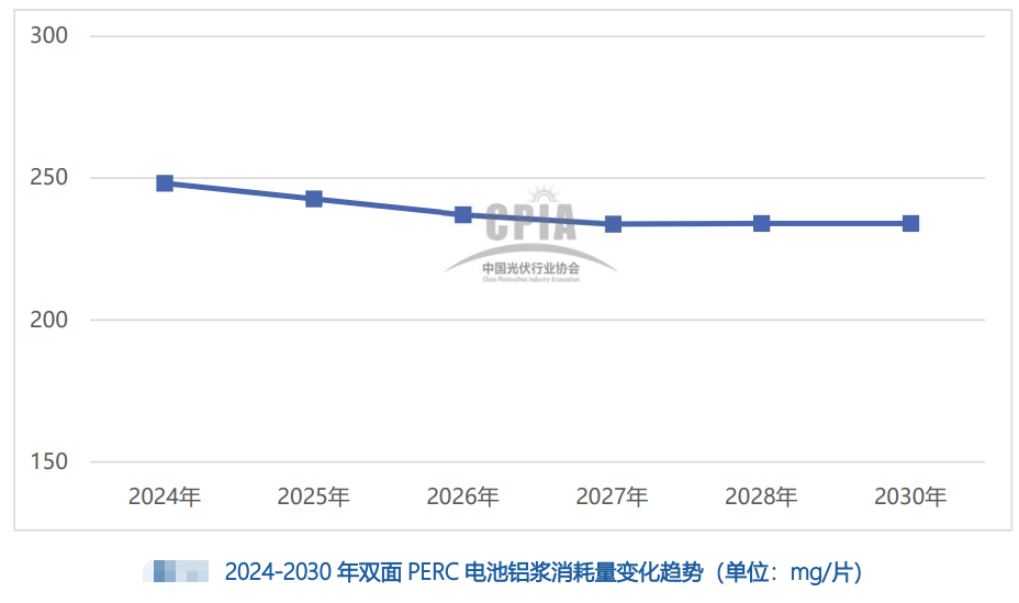 除了電池銀漿以外,該路線圖對主要為晶硅電池片中鋁背場消耗的鋁漿的消耗量也做了說明:隨著雙面PERC電池技術的發展,電池片鋁漿平均消耗量保持下降趨勢。2024年雙面PERC電池片鋁漿消耗量約為248mg/片。隨著未來PERC技術逐漸退出市場,每片電池耗鋁量的水平預計在2027年以后保持停滯。