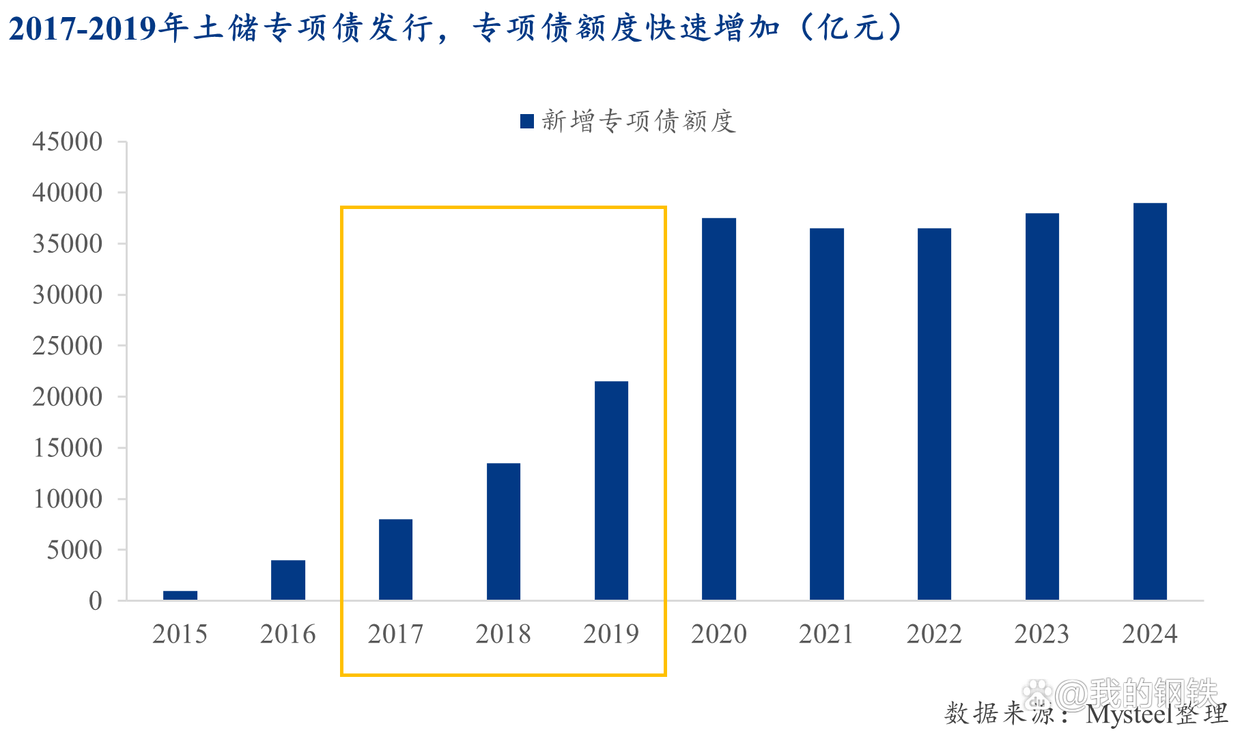 “土儲(chǔ)”專項(xiàng)債的擴(kuò)張可能擠占基建資金:上次大規(guī)模發(fā)行“土儲(chǔ)”專項(xiàng)債是在2017-2019年,推動(dòng)這一時(shí)期專項(xiàng)債總量額度快速增加。因此,推測(cè)2025年專項(xiàng)債額度或在2024年基礎(chǔ)上有所增長(zhǎng),但若專項(xiàng)債資金更多用于土地回購(gòu),而新增基建資金規(guī)模未能同步增長(zhǎng),則可能削弱對(duì)基礎(chǔ)設(shè)施建設(shè)的資金支持,進(jìn)而影響建筑材料需求,包括鋼鐵市場(chǎng)。