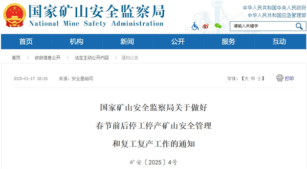近日,為全力防范化解重大安全風險,確保2025年春節前后礦山安全生產,國家礦山安全監察局發布了《關于做好春節前后停工停產礦山安全管理和復工復產工作的通知》,對包括砂石礦山在內的各類礦山企業在春節前后的安全生產工作做出了重要部署,《通知》有效期至2025年6月30日。