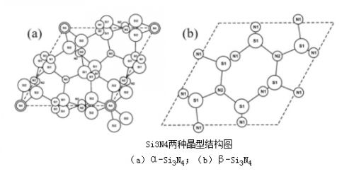 氮化硅晶體有三種晶型,分別是α-Si3N4、β-Si3N4和γ-Si3N4。三種晶型都是以[SiN4]4-四面體為基本結構單元,每個四面體中心是Si原子連接著4個N原子,而4個N原子以共頂點的方式與其他的Si原子連接組成了三維宏觀上的氮化硅晶體。