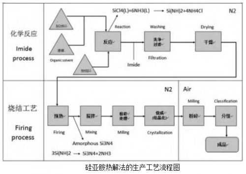 液相反應法(又稱硅亞胺化學分解法)制備的氮化硅粉具有極高的α相含量,并且燒結活性優異。但該方法制備難度大,技術門檻高,對原料的純度要求高,其難點在于不易獲得穩定的固態亞氨基硅(Si(NH)2)。目前,這種方法已經成為商業化高純高質量氮化硅粉體生產所使用的最主要的方法。日本UBE公司是最早使用該方法規模化生產出性能優異、質量穩定的氮化硅粉體產品的廠商。