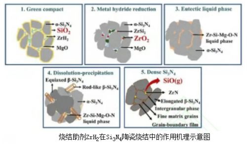 在氮化硅陶瓷燒結過程中,常用的氧化物燒結助劑,包括堿土金屬氧化物(如MgO、CaO)和稀土金屬氧化物(如Y2O3、CeO2、La2O3、Yb2O3等)。這些燒結助劑在高溫下與氮化硅粉體表面的氮化硅和二氧化硅反應生成液相。堿土金屬離子(如Mg2+)可以形成玻璃相,降低液相的形成溫度,有助于提高燒結效率和密度。而稀土金屬離子具有高的氧親和力,能減少氮化硅晶粒中的晶格氧,從而改善氮化硅的結構和性能。
