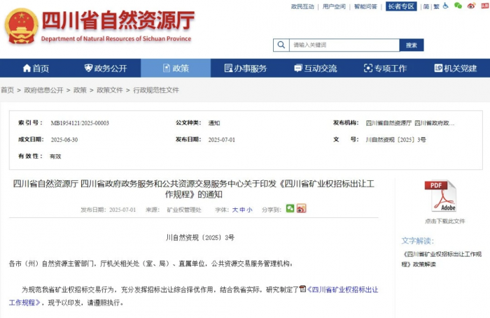 近日,四川省自然資源廳與四川省政府政務服務和公共資源交易服務中心(以下簡稱省政務服務和資源交易服務中心)聯合發布《四川省礦業權招標出讓工作規程》和《四川省省級礦業權出讓網上交易規則》,兩項新規將于8月1日起正式施行,有效期5年。這是四川省首次為礦業權招標出讓單獨制定操作規程,并與升級后的網上拍賣、掛牌規則形成“雙軌并行”體系,進一步規范礦業權出讓網上交易和招標出讓行為,優化流程、提升效率。