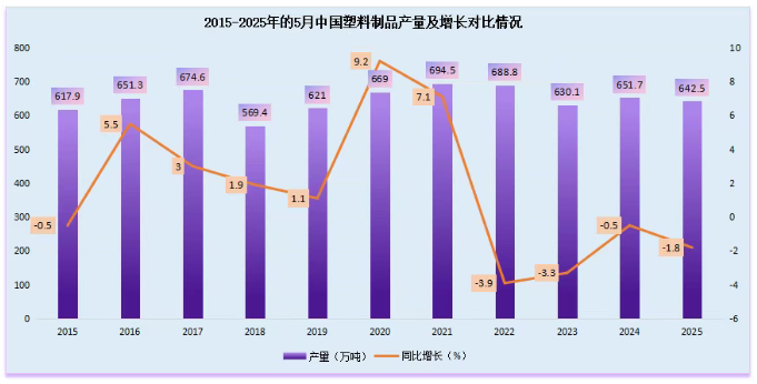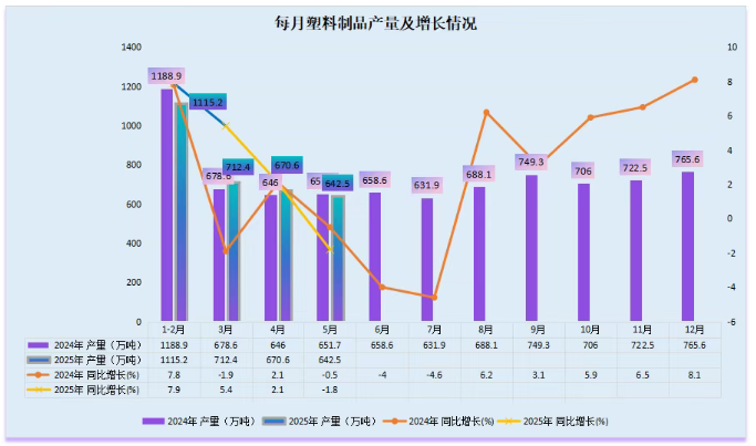 據國家統計局發布數據顯示,2025年5月我國塑料制品產量642.5萬噸,同比下降1.8%。1-5月產量3165.0萬噸,累計增長5.4%。