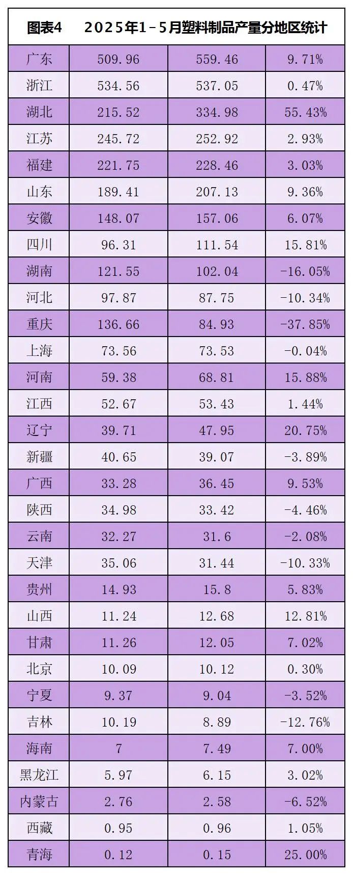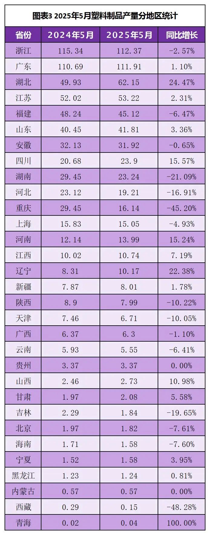 2025年5月,在統計的31個省市中,有13個省市塑料制品產量同比增長,湖北和遼寧增長超過20%。排名前十的省份分別是浙江、廣東、湖北、江蘇、福建、山東、安徽、四川、湖南、河北,總產量524.85萬噸,占全國的81.69%。浙江產量排名第一,產量112.37萬噸,同比下降2.57%。