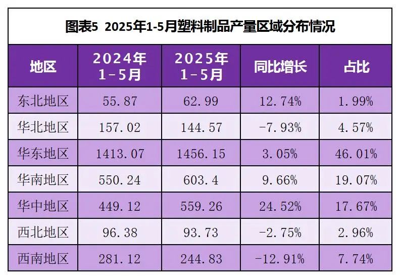1-5月,華東地區以1456.15萬噸的產量位居榜首,占總產量的46.01%,顯示出其在塑料制品生產方面的絕對優勢。東北地區產量為62.99萬噸,占總產量的1.99%,是產量最低的區域。華東、華南和華中地區合計占總產量的82.75%,是塑料制品生產的主要集中地。
