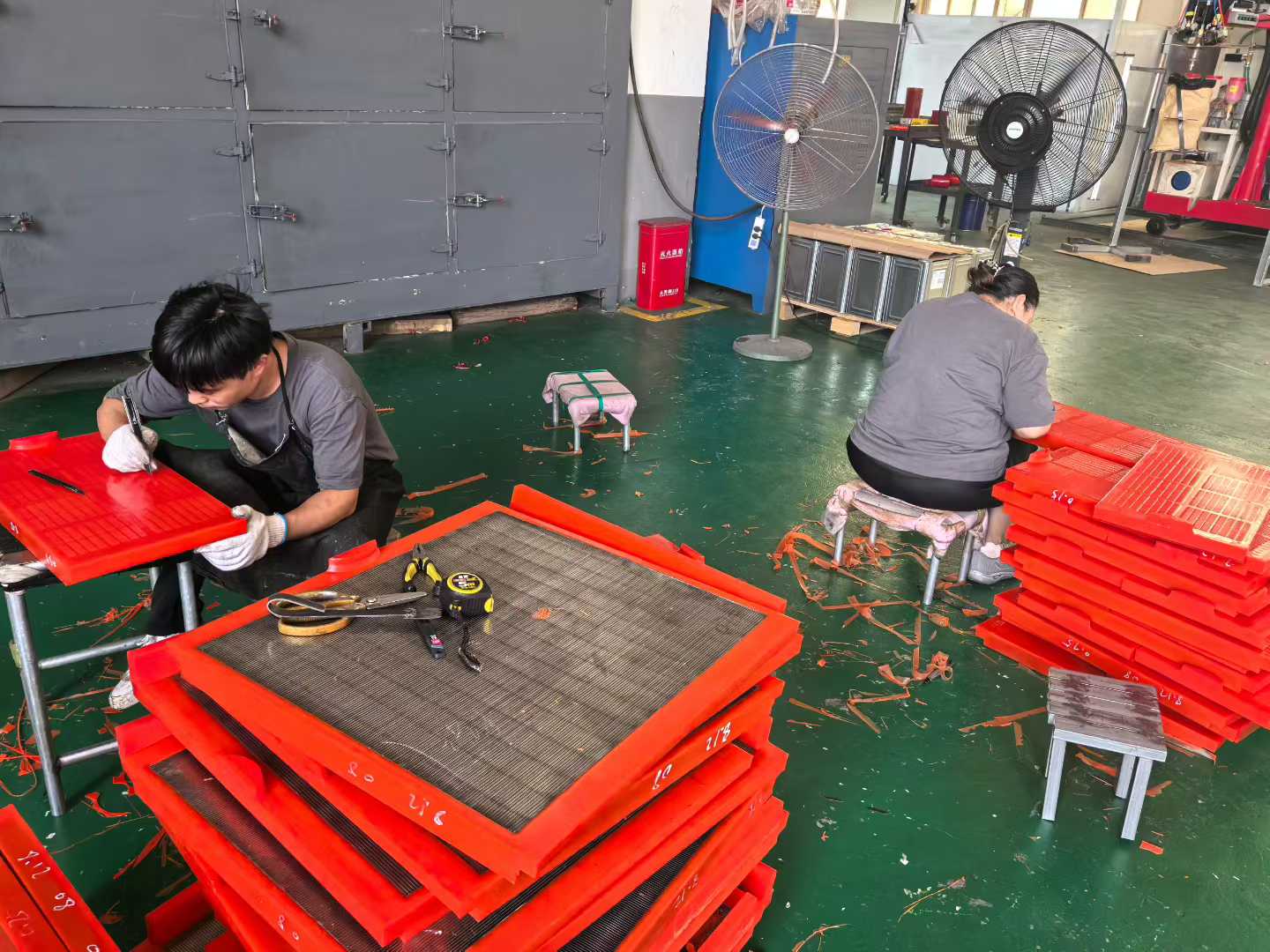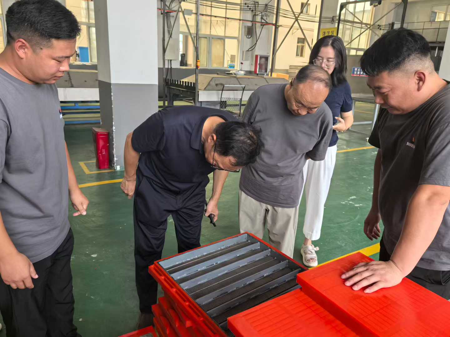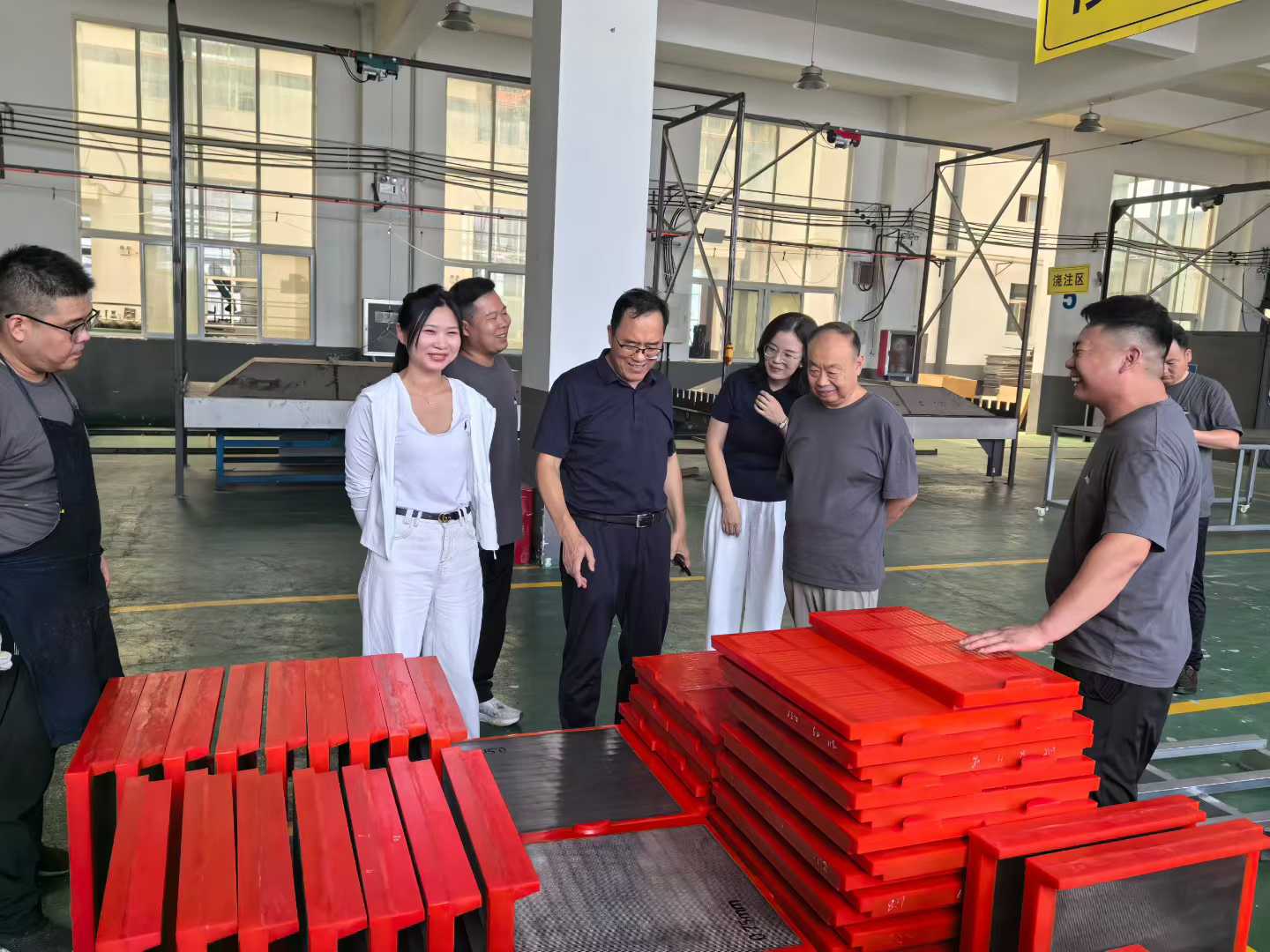 抵達奧申科技后,公司負責人熱情接待了賀會長一行,并陪同參觀了企業的生產車間。走進生產車間,機器運轉的轟鳴聲此起彼伏,工人們在各自的崗位上有條不紊地忙碌著。每一個環節都井然有序。負責人介紹,奧申科技在篩板生產上有著嚴格的流程把控,尤其在聚氨酯篩板的生產中,采用了獨特的配方工藝,使得產品具有耐磨性強、使用壽命長、篩分效率高等優勢,深受礦山、冶金、建材等行業客戶的青睞。