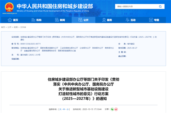 近日,住房城鄉(xiāng)建設(shè)部辦公廳等9部門印發(fā)《貫徹落實(shí)〈中共中央辦公廳、國(guó)務(wù)院辦公廳關(guān)于推進(jìn)新型城市基礎(chǔ)設(shè)施建設(shè)打造韌性城市的意見(jiàn)〉行動(dòng)方案(2025-2027年)》(以下簡(jiǎn)稱《行動(dòng)方案》),旨在推進(jìn)數(shù)字化、網(wǎng)絡(luò)化、智能化新型城市基礎(chǔ)設(shè)施建設(shè),增強(qiáng)城市風(fēng)險(xiǎn)防控和治理能力。