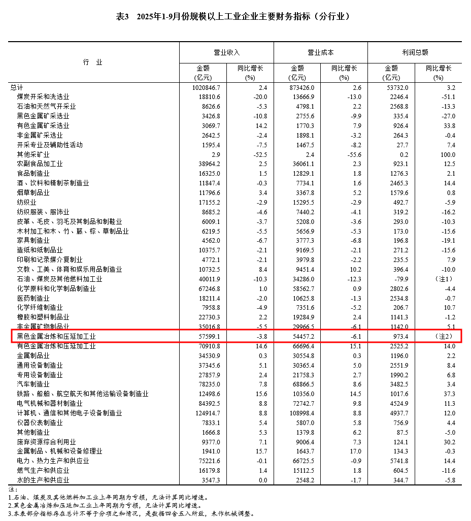 1—9月份,黑色金屬冶煉和壓延加工業利潤總額973.4億元。