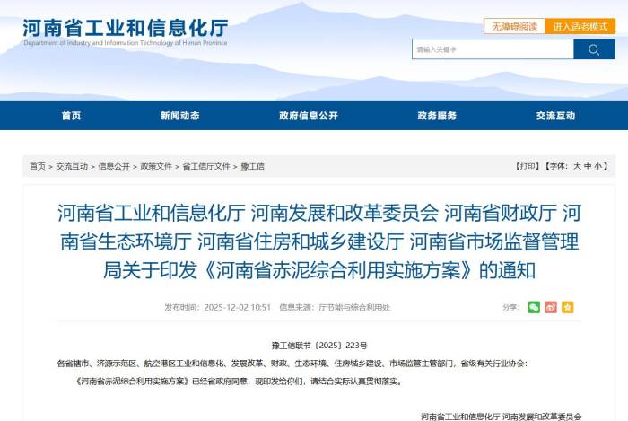 近日,河南省工業和信息化廳聯合省發展改革委、財政廳、生態環境廳、住房城鄉建設廳、市場監督管理局等六個部門,正式印發了《河南省赤泥綜合利用實施方案》(豫工信聯節〔2025〕223號)。