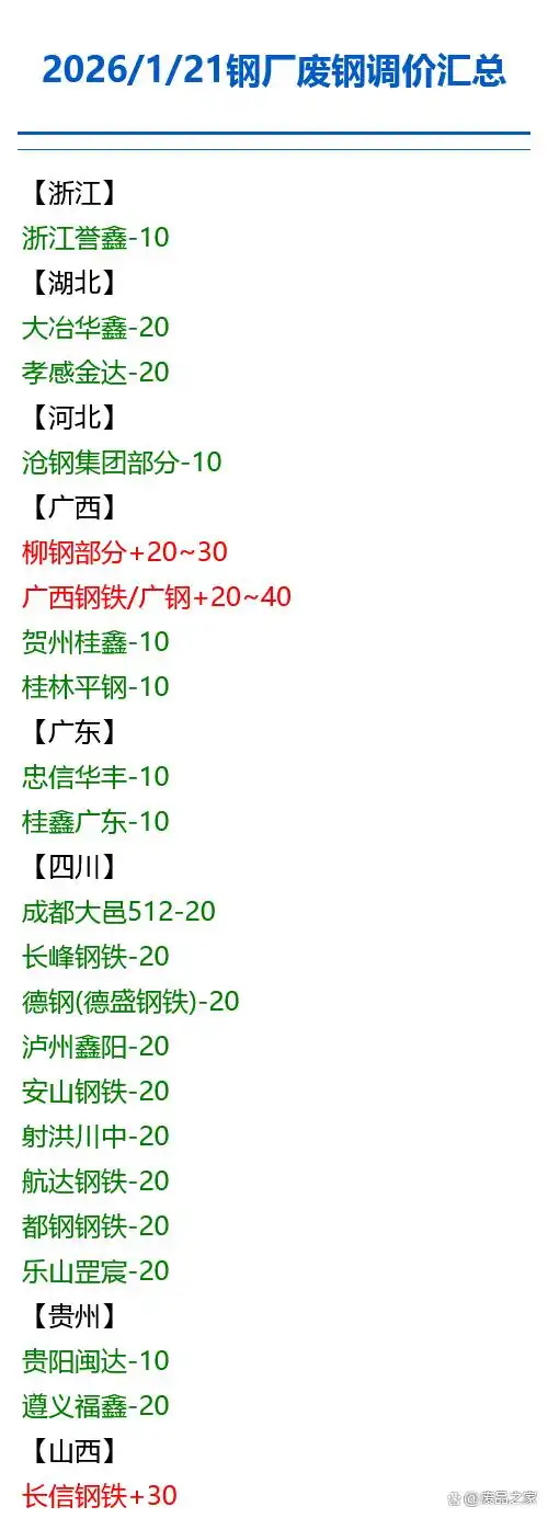 1月21日全國(guó)廢鋼主穩(wěn)個(gè)調(diào)運(yùn)行。漲價(jià)鋼企分布在廣西、山西等地區(qū),漲幅20~40元/噸;跌價(jià)鋼企主要分布在四川、河北、廣東等地,跌幅5~20元/噸不等。盤面維持弱勢(shì)運(yùn)行,天氣對(duì)廢鋼加工和物流影響逐步減弱,部分商家開始積極出貨,但隨著上游產(chǎn)廢端供應(yīng)縮減,鋼企年尾回款困難等因素,廢鋼資源或難以出現(xiàn)放量,預(yù)計(jì)短期廢鋼底部仍具備支撐,或持穩(wěn)運(yùn)行。