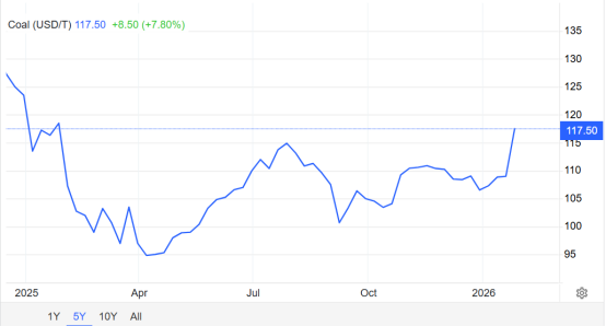 據外媒2月2日報道的消息,路孚特(Refinitiv)數據顯示,上周五(2026年1月30日)交易日,全球動力煤基準洲際交易所(ICE)紐卡斯爾煤炭期貨合約交易價格繼續大漲,當日收盤價上漲至117.50美元/噸,環比前一交易日每噸上漲5.75美元,漲幅達5.14%,直逼預期的120美元/噸關口。