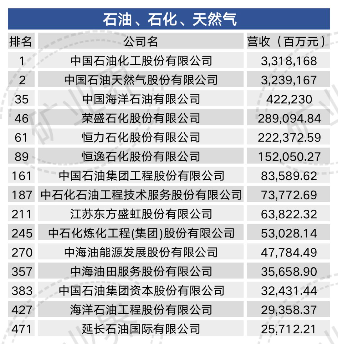 中國石化、中國石油位列上榜涉礦企業前兩名,同時也是總榜的狀元和榜眼,去年的營業收入分別為3.32萬億元和3.24萬億元。