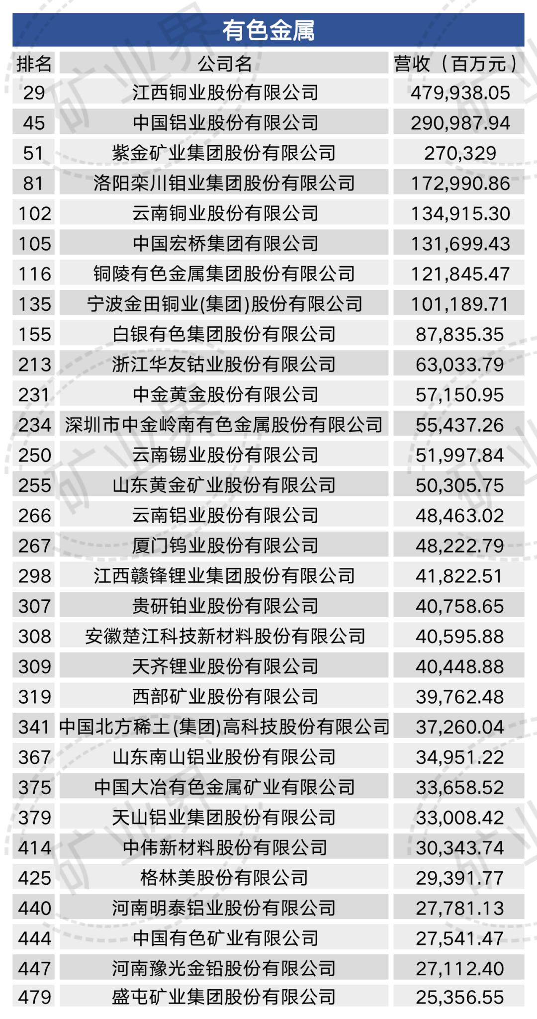 有色金屬方面,江西銅業、中國鋁業、紫金礦業和洛陽鉬業進入2023年中國上市公司500強總榜前100名,排名分別為29名、45名、51名和81名,去年營收分別為4799.38億元、2909.88億元、2703.29億元和1729.91億元。