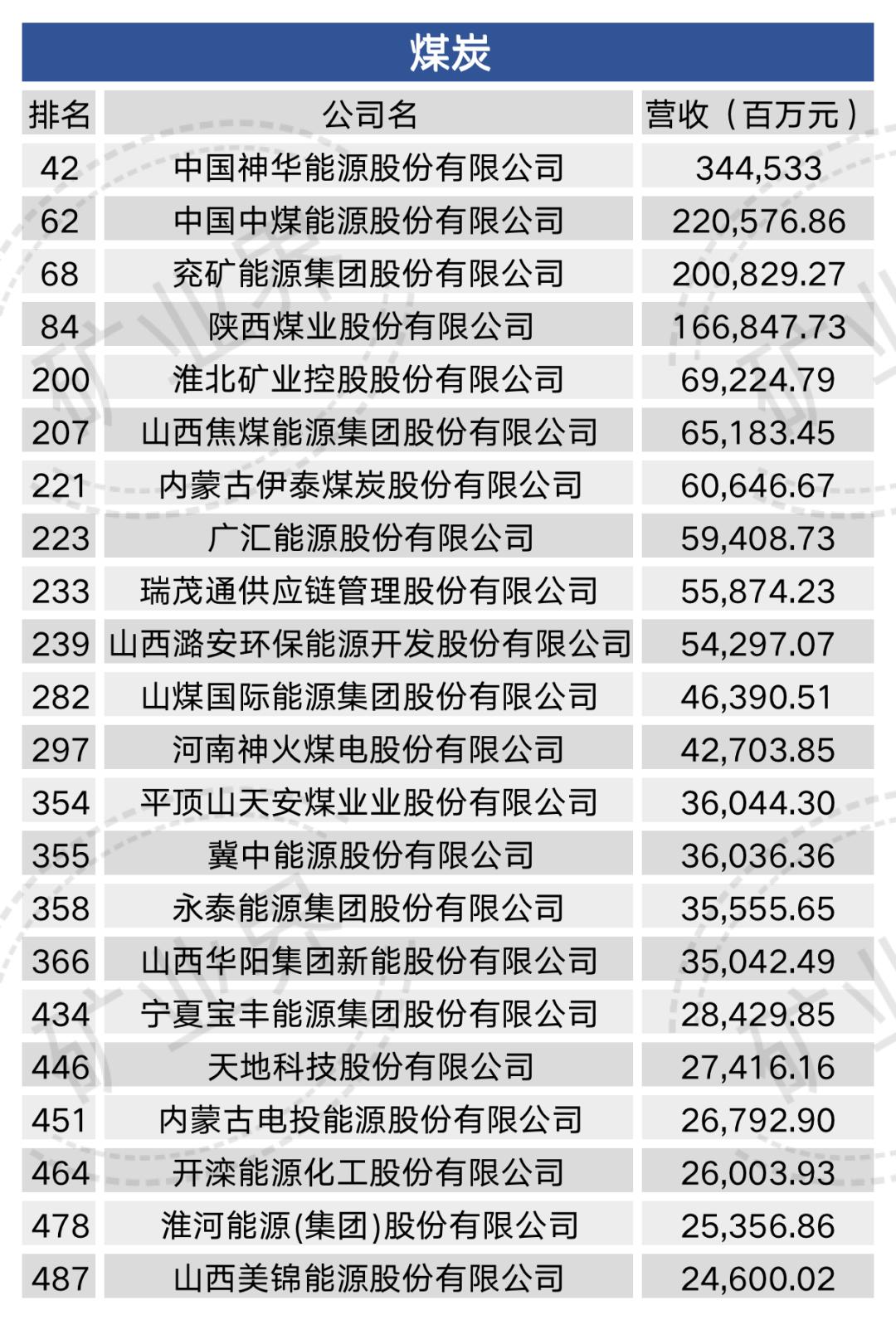 煤炭類上榜涉礦企業中,中國神華、中煤能源和兗礦能源位列前三,在總榜中的排名分別是42名、62名和68名,去年營收分別為3445.33億元、2205.77億元和2008.29億元。