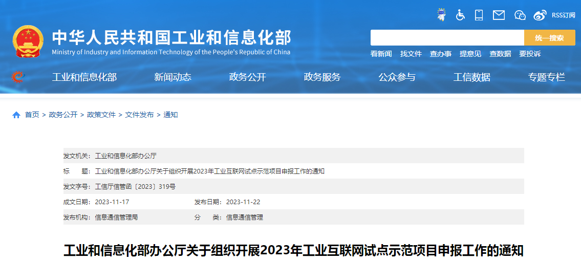 為深入實施工業互聯網創新發展戰略,促進工業互聯網融合應用,按照《工業互聯網創新發展行動計劃(2021-2023年)》(工信部信管〔2020〕197號)《工業互聯網專項工作組2023年工作計劃》(工信廳信管〔2023〕141號)要求,現組織開展2023年工業互聯網試點示范項目申報工作。有關事項通知如下: