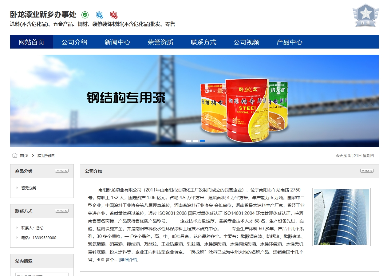 南陽臥龍漆業有限公司(2011年由南陽市油漆化工廠改制而成立的民營企業),位于南陽市車站南路 2760 號,有職工 152 人,固定資產 1.06 億元,占地 4.5 萬平方米,建筑面積 3 萬平方米,年產能力 6 萬噸。國家中二型企業,中國涂料工業協會第八屆理事單位,河南省涂料行業協會 會長單位,河南省最大涂料生產廠家,省輕工業先進企業,省質量信得過單位,通過 ISO9001:2008 國際質量體系認證 ISO14001:2004 環境管理體系認證,獲河南省著名商標,產品獲得省優質產品稱號。