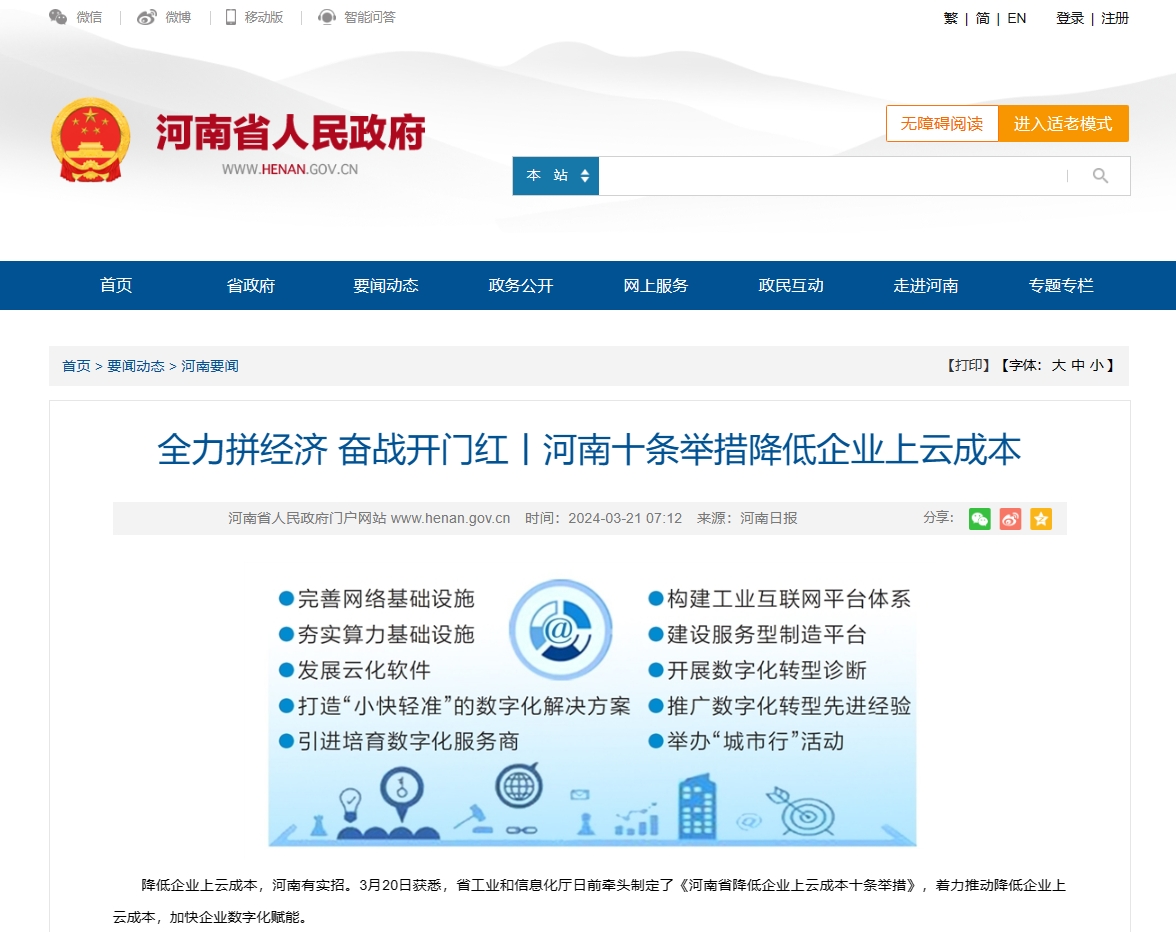 降低企業上云成本,河南有實招。3月20日獲悉,省工業和信息化廳日前牽頭制定了《河南省降低企業上云成本十條舉措》,著力推動降低企業上云成本,加快企業數字化賦能。