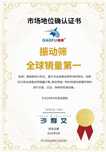 5月17日,中原農(nóng)谷第二屆振動(dòng)機(jī)械產(chǎn)業(yè)博覽會(huì)上進(jìn)行一項(xiàng)重要的授牌儀式,弗若斯特沙利文(Frost & Sullivan)為新鄉(xiāng)市高服機(jī)械股份有限公司(簡(jiǎn)稱:高服機(jī)械)頒發(fā)“振動(dòng)篩全球銷售第一”的市場(chǎng)地位確認(rèn)證書(shū),這一殊榮彰顯了高服機(jī)械在全球振動(dòng)篩領(lǐng)域的卓越成就。