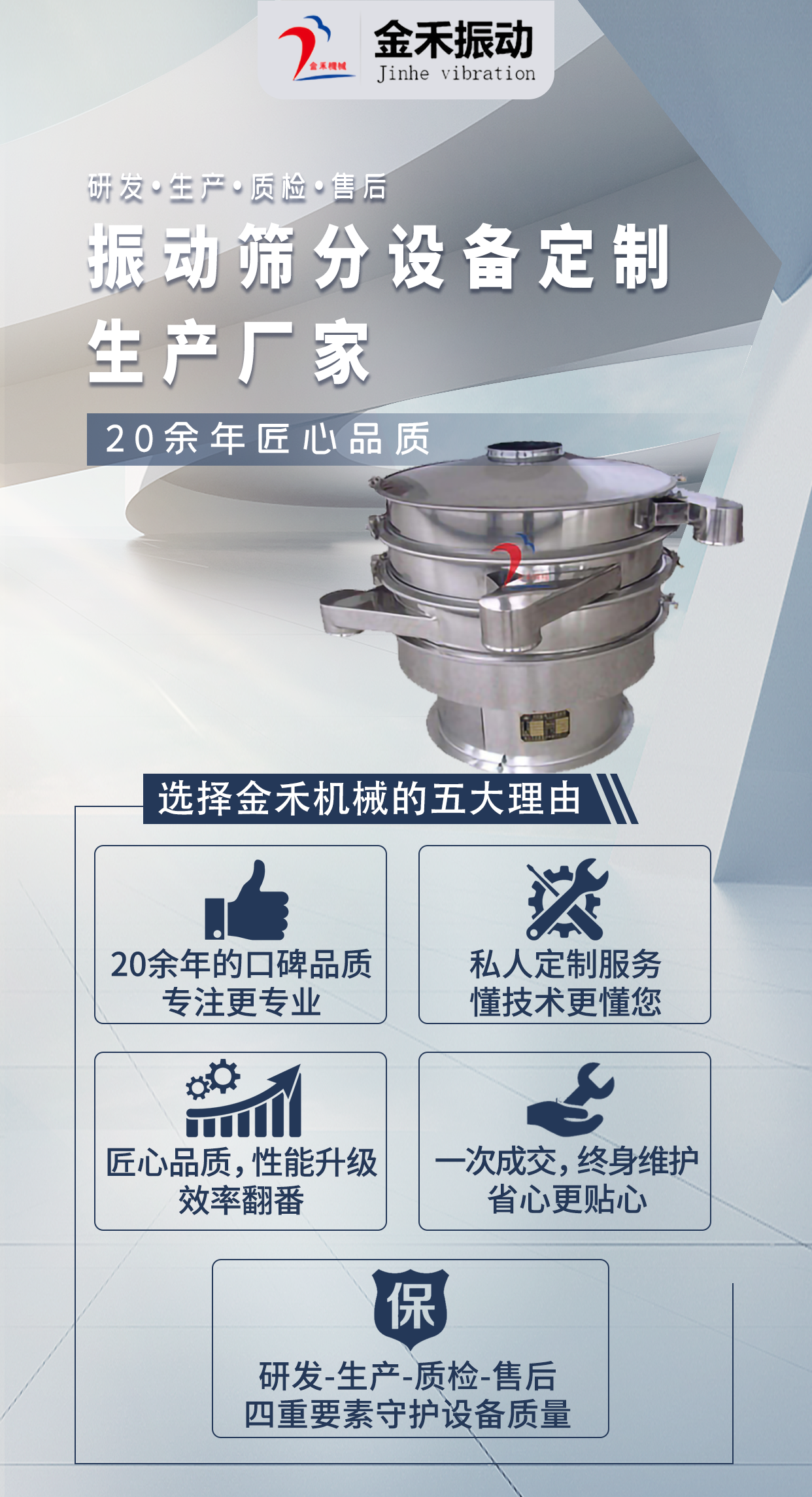 新鄉市金禾機械有限公司,是一家專業從事各種振動篩分設備的研發和生產的廠家。以近30年專業研制各種超聲波振動篩、直線篩、旋振篩、高頻篩、氣流篩、實驗室標準篩、以及振動平臺、提升輸送等設備的豐富經驗,為包括食品、醫藥、化工、建材、環保等近15個行業輸送優秀的振動篩分設備,累計為超過60000多家客戶服務。