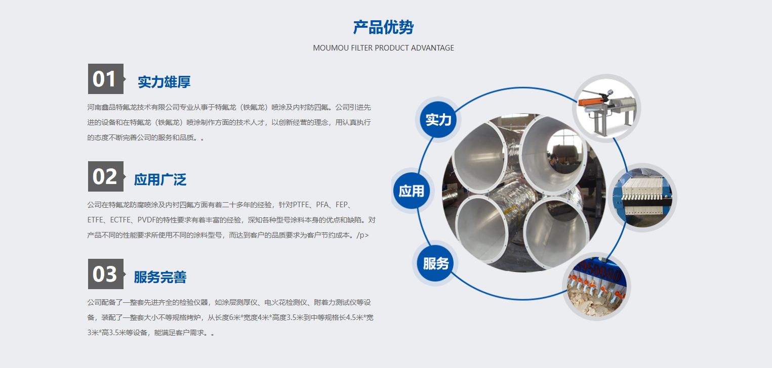 公司在特氟龍防腐噴涂及內襯四氟方面有著二十多年的經驗,針對PTFE、PFA、FEP、ETFE、ECTFE、PVDF的特性要求有著豐富的經驗,深知各種型號涂料本身的優點和缺陷。對產品不同的性能要求所使用不同的涂料型號,而達到客戶的品質要求為客戶節約成本。