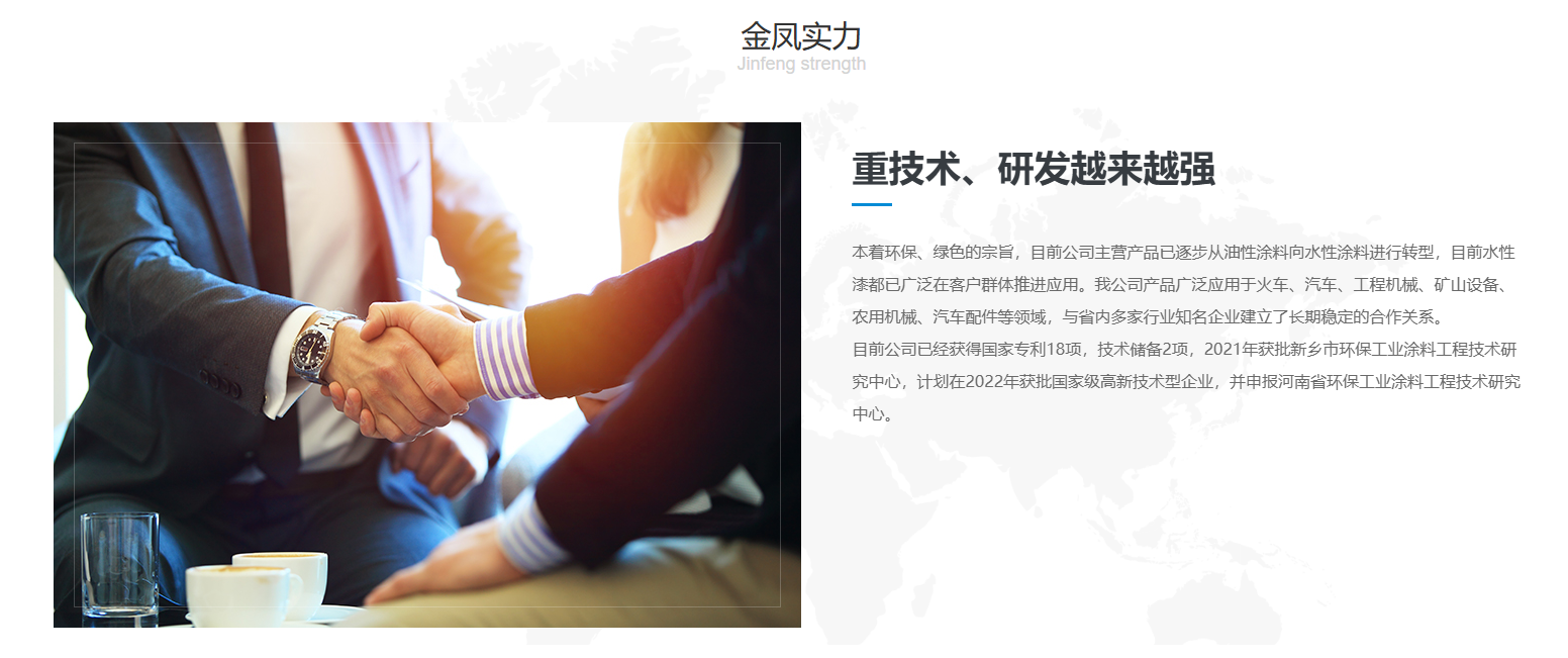 河南省金鳳化工有限公司成立于1995年,現坐落于河南省獲嘉產業集聚區化工園區,距鄭州50公里,公司占地70余畝,建筑面積16000平方米,年生產能力25000噸。主要以生產環保型工業涂料為主,有丙烯酸聚氨酯類涂料、環氧系列涂料、氨基系列涂料、環保型金屬表面前處理劑、特種涂料等產品,廣泛服務于火車、汽車、工程機械、礦山設備、農用機械、汽車配件等領域,與國內多家知名企業建立了長期穩定的合作關系。產品通過了ISO9001質量管理體系認證、ISO14001環境管理體系認證和GB/T28001職業健康管理體系認證。 目前公司已獲得國家專利18項,技術儲備多項,2021年獲批新鄉市環保工業涂料工程技術研究中心,同時承擔河南省環保工業涂料工程技術研究中心的前期籌備和建設任務,公司即將在2022年獲批高新技術型企業。
