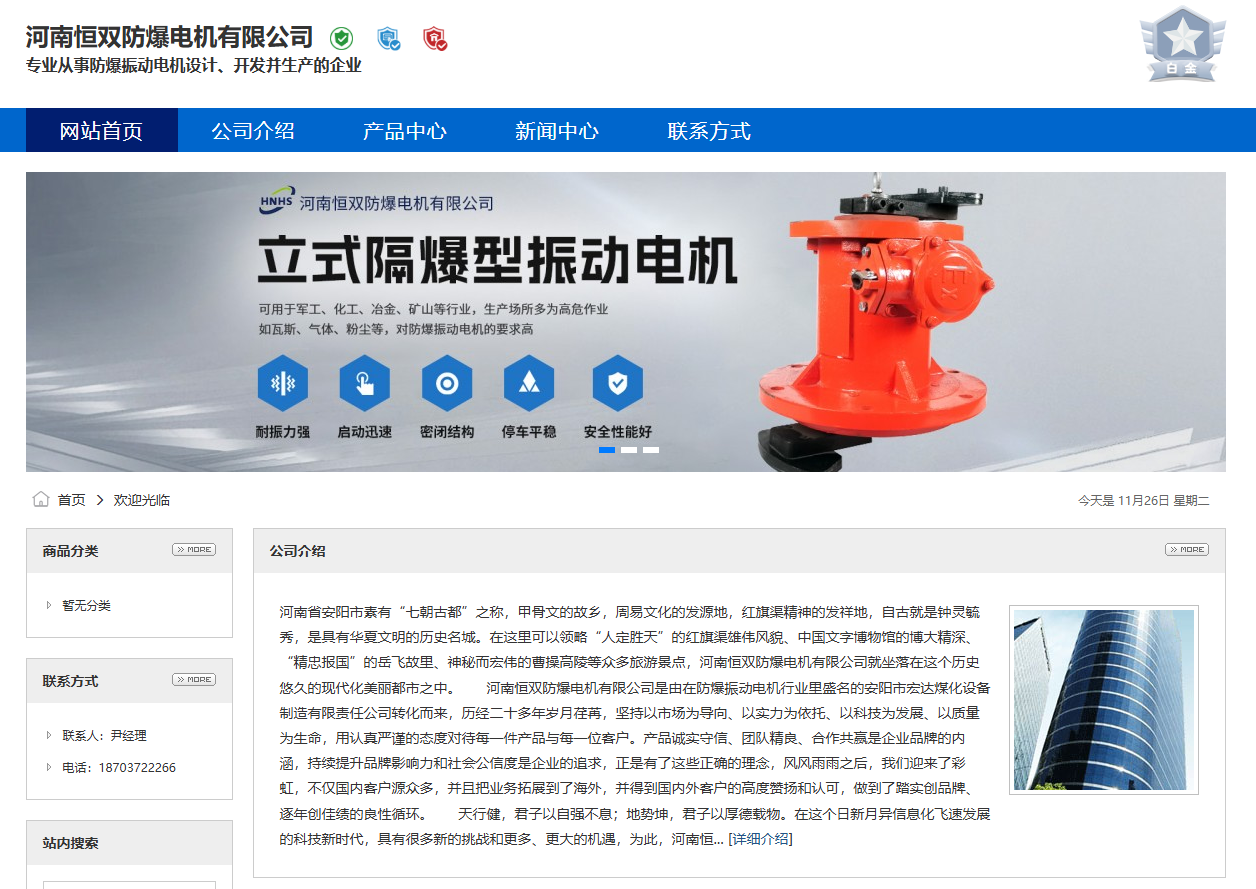河南恒雙防爆電機(jī)有限公司是一家專業(yè)從事防爆振動電機(jī)設(shè)計、開發(fā)并生產(chǎn)的企業(yè),是由在行業(yè)中負(fù)有盛名具有二十多年設(shè)計生產(chǎn)經(jīng)驗的安陽市宏達(dá)煤化設(shè)備制造有限責(zé)任公司轉(zhuǎn)化而來。企業(yè)具有國家防爆電氣產(chǎn)品質(zhì)量監(jiān)督檢驗中心、安標(biāo)國家礦用產(chǎn)品安全標(biāo)志中心所發(fā)放的專業(yè)要求嚴(yán)格的CCC強(qiáng)制性產(chǎn)品認(rèn)證、防爆合格證、煤安證、ISO9001:2000國家質(zhì)量體系認(rèn)證等相關(guān)資質(zhì)。