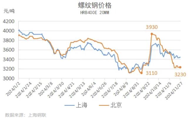 鋼材行情持續下跌。11月份鋼材價格整體延續震蕩下跌態勢,與國慶節的高點相比,上海鋼聯Myspic鋼材綜合指數降幅約9%,螺紋鋼現貨市場價格降幅普遍在300元/噸以上,北京地區降幅達700元/噸。昨日上海地區螺紋鋼價格報3440元/噸,北京地區螺紋鋼價格報3230元/噸,南北價差明顯拉大。近日,鋼材價格跌勢收斂,出現企穩反彈跡象。