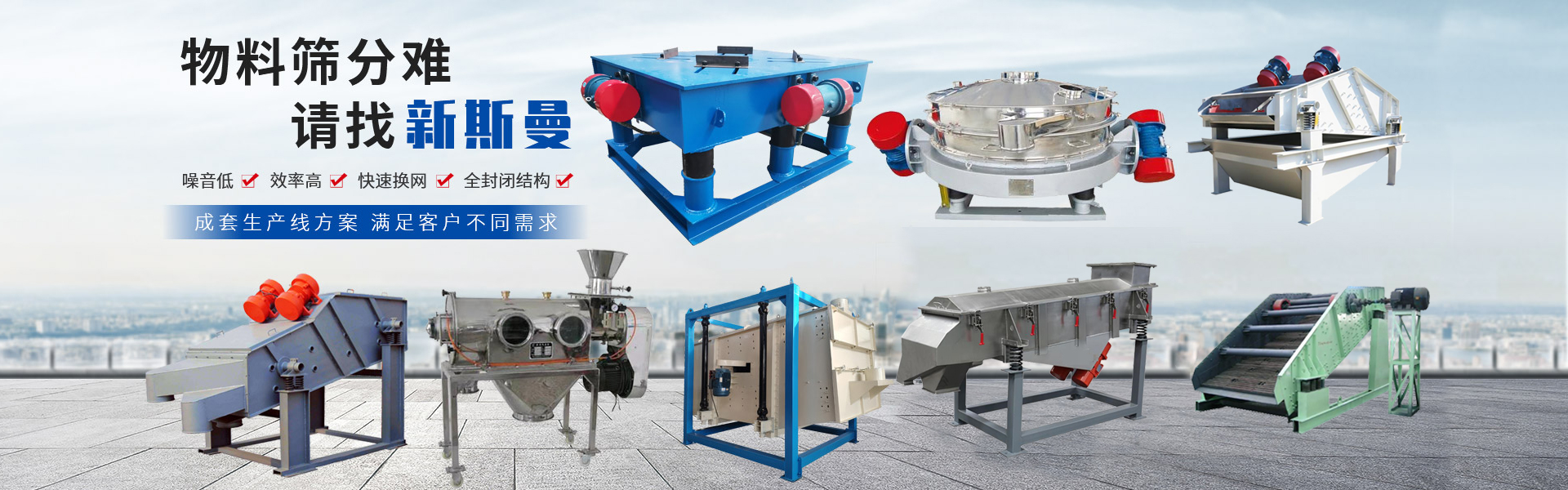 公司致力于研發定制各種標準及非標篩分設備及配套生產線,主要產品有XSM系列三次元振動篩、篩分過濾機、旋振篩、直線振動篩、超聲波振動篩、礦用振動篩、圓振動篩、直排篩、真空上料機、無塵投料站、噸包投料站、標準檢驗篩(藥典篩)、搖擺篩、氣流篩、氣旋篩、過濾篩、拍擊式標準振篩機、振動電機、螺旋輸送機、垂直提升機、振動給料機、振動平臺、高頻振動平臺、倉壁振動器以及輸送機、提升機設備等。