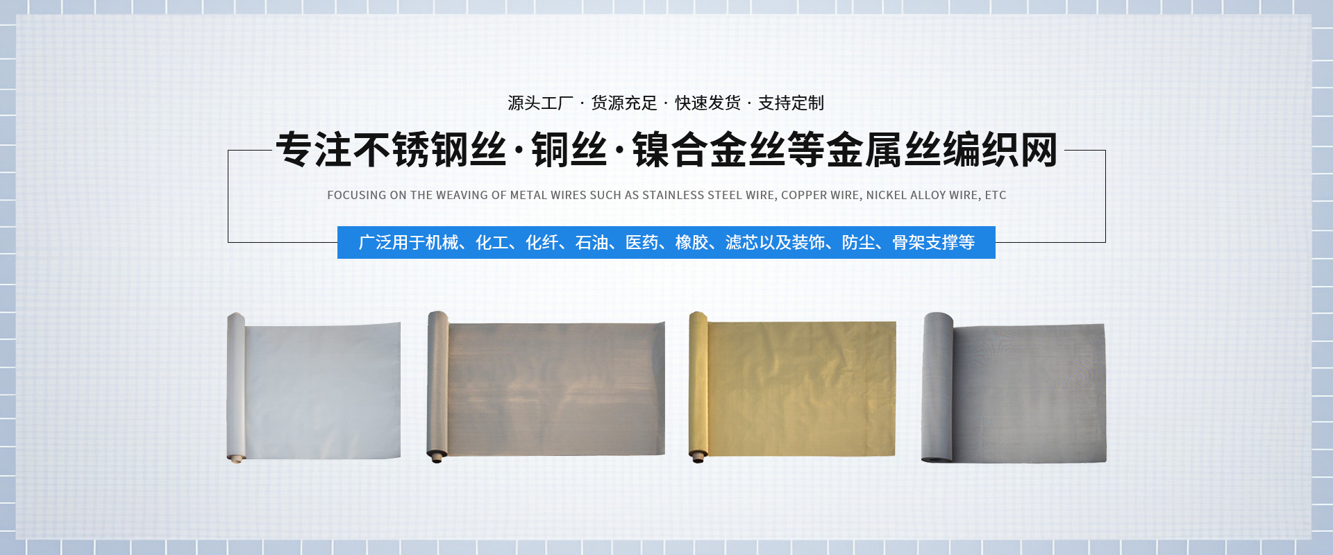 公司擁有生產(chǎn)設(shè)備和技術(shù)人員,主要生產(chǎn)不銹鋼篩網(wǎng)、磨料網(wǎng)、金屬絲編織方孔網(wǎng)、篩網(wǎng)、濾網(wǎng) 、篩分網(wǎng) 、過濾網(wǎng)、不銹鋼網(wǎng)、絲網(wǎng)、金屬絲網(wǎng)、金屬絲編織密紋網(wǎng)、特種網(wǎng)、不銹鋼密紋網(wǎng)、荷蘭網(wǎng)、席型網(wǎng)。絲網(wǎng)材質(zhì)選用黃銅、錫青銅、不銹鋼、純鎳等。席型網(wǎng)規(guī)格7/44目—500/3500目,方孔網(wǎng)規(guī)格1/2目—500目,網(wǎng)孔25mm—0.028mm,產(chǎn)品廣泛用于機械、化工、化纖、石油、醫(yī)藥、橡膠、濾芯、固體果粒篩分、流體過濾以及裝飾、防塵、骨架支撐等。
