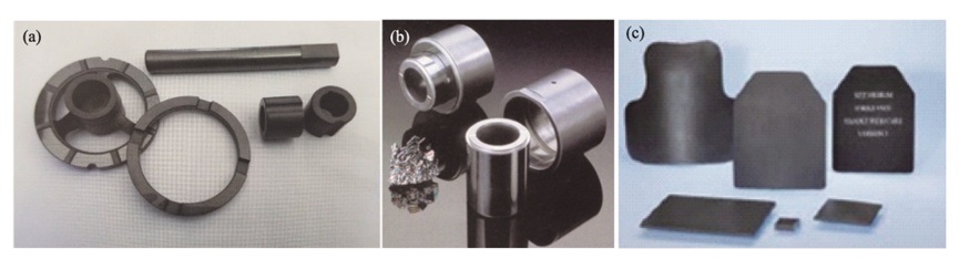 在應用方面,SiC的無壓燒結操作簡單,成本適中,適用于不同形狀的陶瓷零部件的批量化生產,廣泛應用于的耐磨損耐腐蝕的密封環、滑動軸承等。此外,無壓燒結碳化硅陶瓷因其硬度高、比重小、彈道性能好、破碎后吸收更多能量的能力和價格低廉而被廣泛應用于防彈裝甲,如車輛和船只的保護,以及民用保險箱和運鈔車的保護。作為防彈裝甲材料,它具有很好的耐多擊性,整體防護效果優于普通碳化硅陶瓷;用于圓柱形陶瓷體輕防護裝甲時,其斷裂點可達65噸以上,防護效果明顯優于使用普通碳化硅陶瓷的圓柱形陶瓷體防護裝甲。