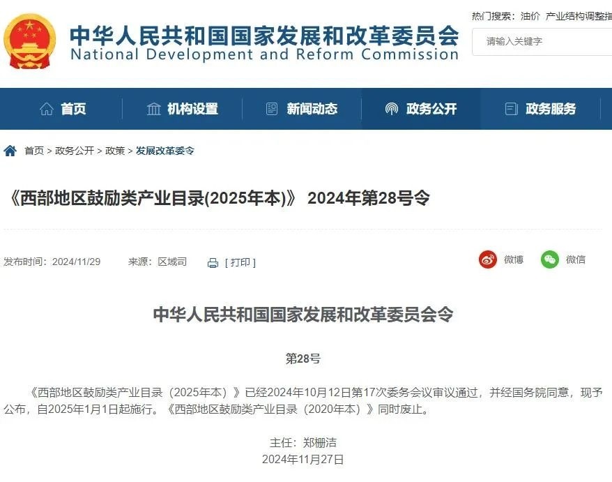近日,經國務院同意,國家發展改革委修訂出臺《西部地區鼓勵類產業目錄(2025年本)》(以下簡稱《目錄》),自2025年1月1日起施行。