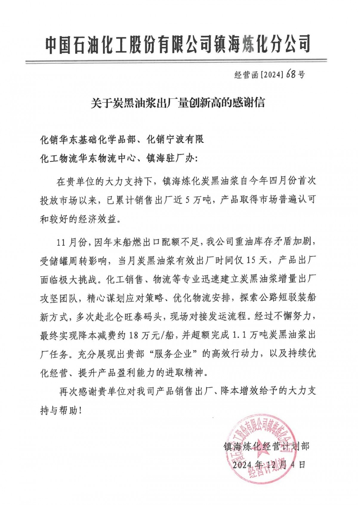 信中指出,鎮海煉化的炭黑油漿產品自今年4月首次進入市場以來,便以其優良的品質迅速獲得了市場的廣泛認可,至今已累計銷售出廠接近5萬噸,實現了良好的經濟效益。