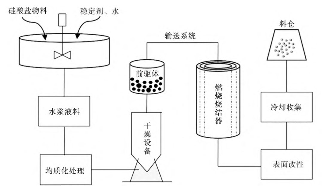 噴霧干燥法具有坯體形成穩定方便,生產效率高,產品空心率高,成本相對較低等優勢,被廣泛認為是一種可以用于工業化生產空心玻璃微珠的方法,但此種方法生產出來的微珠物理和機械性能要低于玻璃粉末法生產的微珠,且化學穩定性差。
